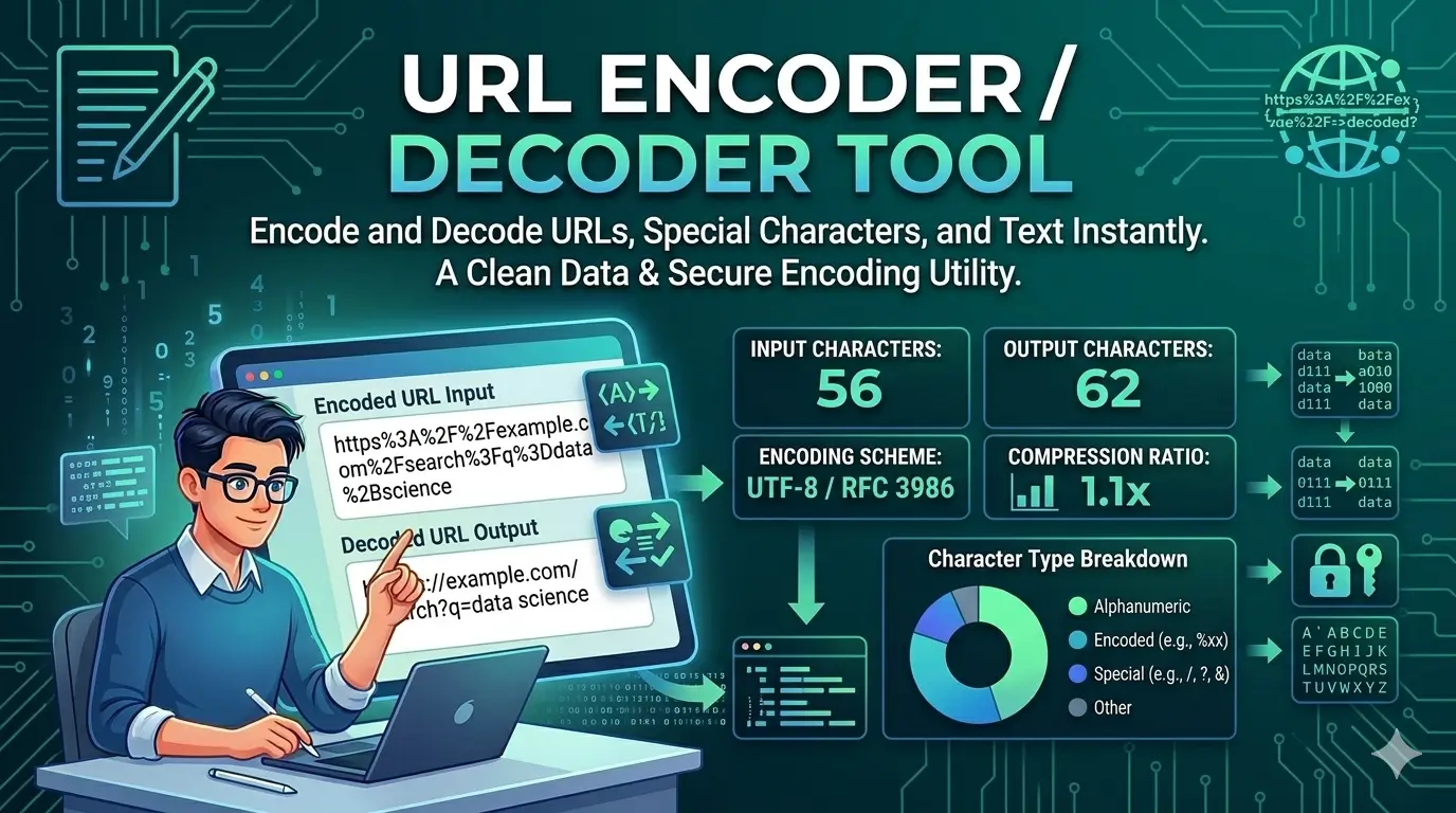 Encode special characters in URLs or decode encoded URLs. Essential for tracking parameters and clean links.