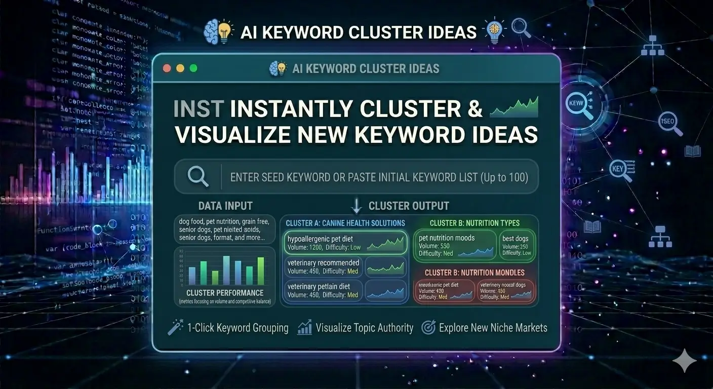 AI Keyword Cluster Ideas April 10, 2026 by proadsflexofficial Keyword Cluster Ideas | SEO Toolkit 🧠 AI Keyword Cluster Ideas Group semantically related keywords to build topical authority. 🎯 Seed Keyword / Topic 🌐 Niche / Industry (optional) 🔮 Generate Cluster Ideas
