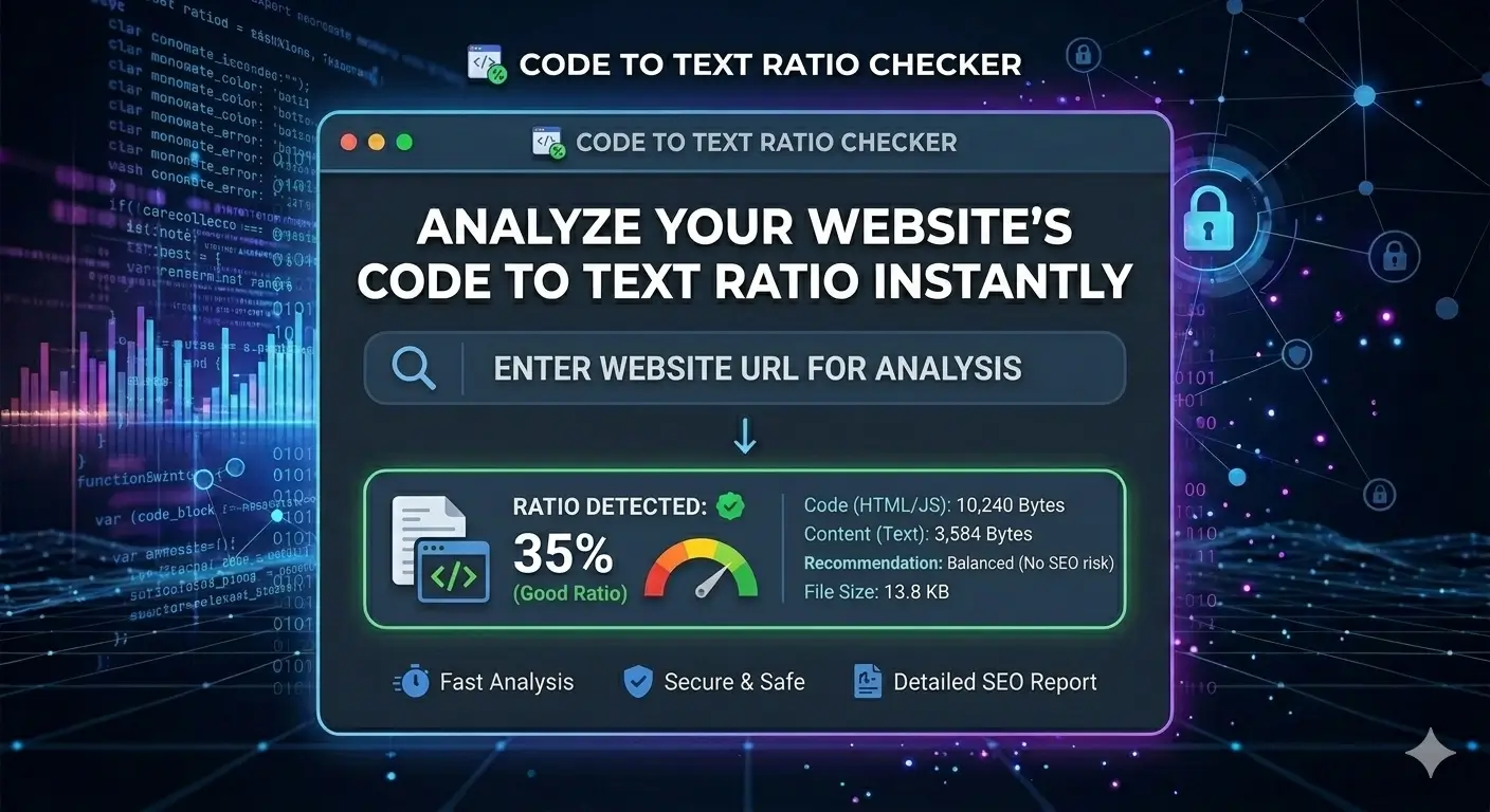 Analyze the ratio of visible text to HTML code on a webpage. Higher text ratio is better for SEO.