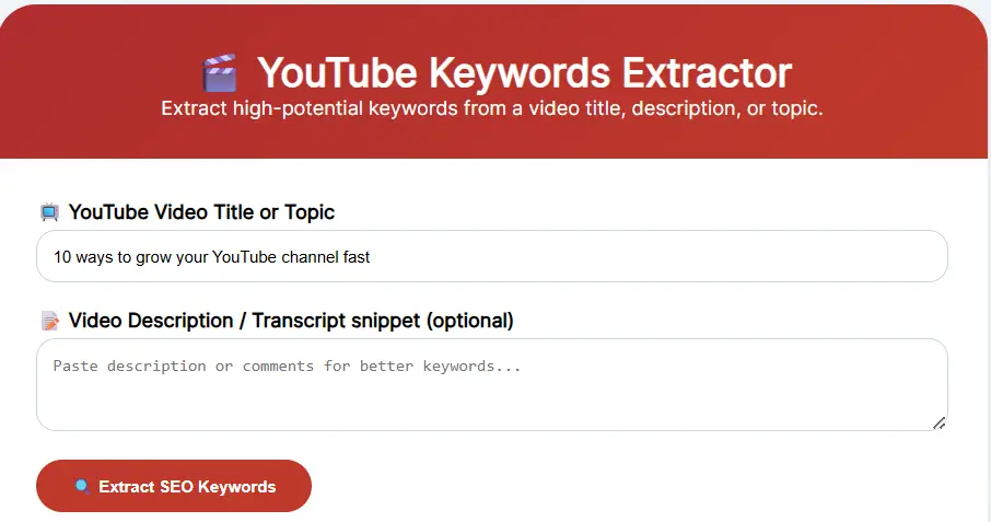 YouTube Keywords Extractor April 10, 2026 by proadsflexofficial YouTube Keywords Extractor | SEO Toolkit π¬ YouTube Keywords Extractor Extract high-potential keywords from a video title, description, or topic. πΊ YouTube Video Title or Topic π Video Description / Transcript snippet (optional) π Extract SEO Keywords